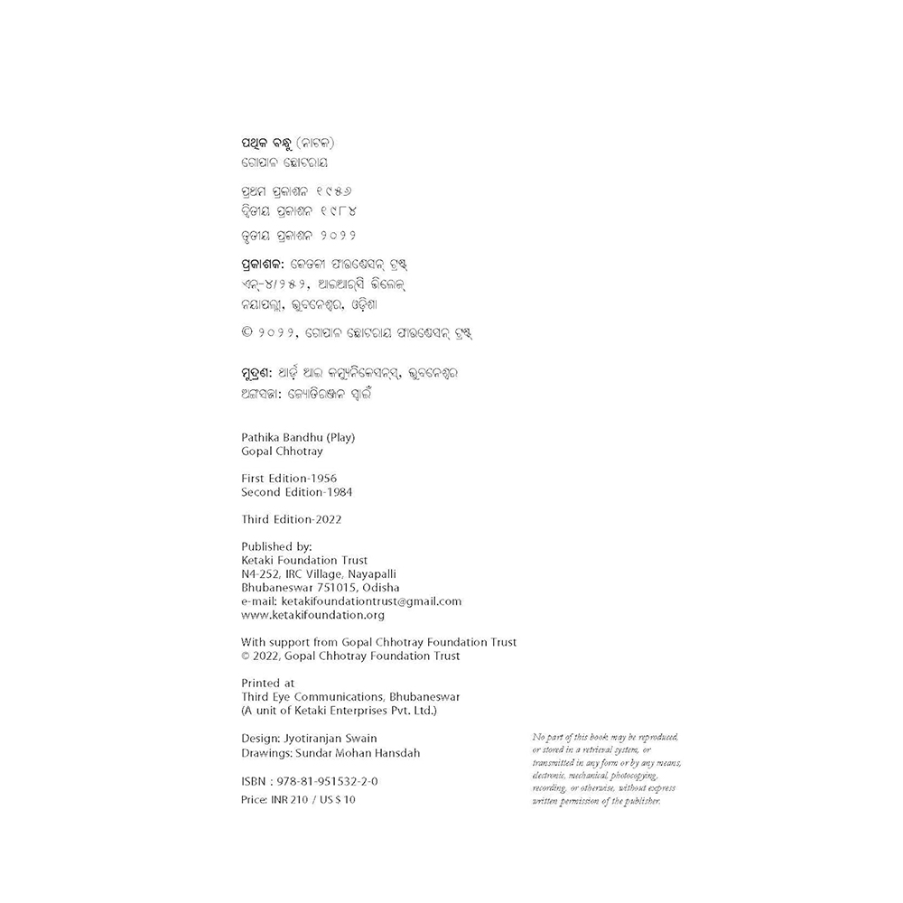 Pathika Bandhu (Play) -A Centenary Publication by Gopal Chhotray Foundation Trust, Cuttack. Print and Distribution by Ketaki Foundation Trust, Bhubaneswar